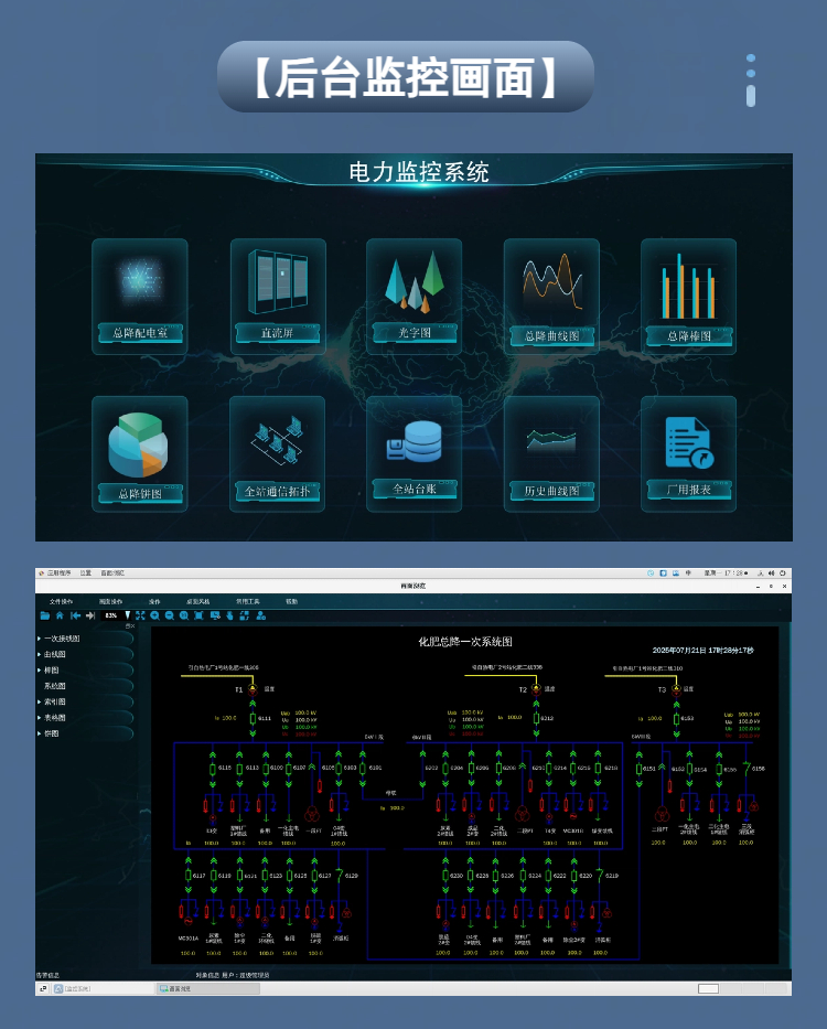 综合应用监控系统是基于变电站自动化整体解决方案,运用计算机技术、网络通信技术,采集电网运行信息和一二次设备运行状态信息,通过标准化接口交互,实现全景数据采集、处理、监视、控制,可运行在各种操作系统平台,实现变电站的无人值守,综合应用监控,保障供电的安全、稳定、经济运行要求。